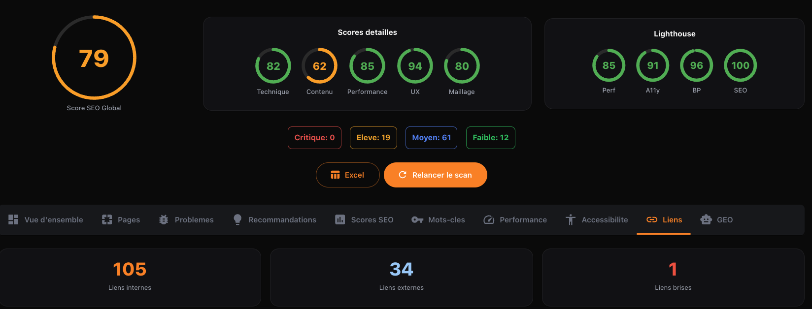 TeckBlaze integrates axe-core into its crawl process. For each visited page, our engine runs a complete accessibility analysis in a real browser (Chromium via Playwright). This allows detecting not only issues in static HTML but also those related to dynamic JavaScript, interactive components, and client-side rendering. Results are aggregated into a unified dashboard that sorts violations by type, severity, and frequency. You can see exactly which pages are affected, which HTML element causes the issue, and how to fix it. The report also includes an overall accessibility score and a comparison with your industry benchmarks.