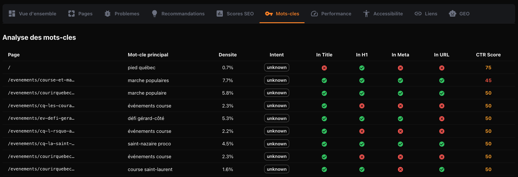 - Technical SEO score (tags, schema, robots.txt, sitemap)